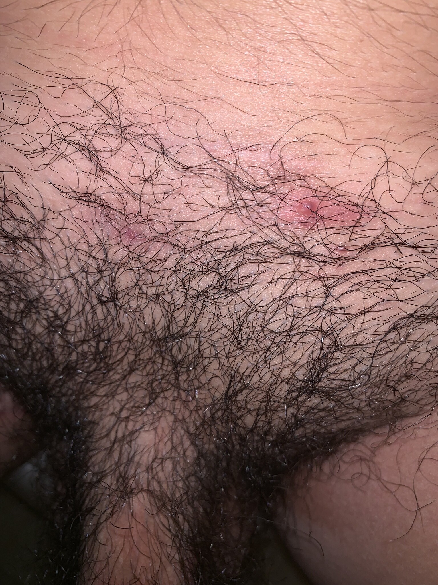 hello, i have this red bump on my pubic hair area. ive never had unprotected sex before nor does it hurt when i pee or any fevers or discharge or any symptoms like that, only bothers me if i apply pressure to it. I have trimmed my pubic hairs before using a trimmer and got a bump similar like this that got big and then sort of went away and turned into the red spot you see in the middle. When i had that first bump i got an STD test at planned parenthood(peed in a cup, blood drawn, and finger picked at) and everything came out negative. I’m just not sure if they tested for herpes or is that what is tested for with the blood test?